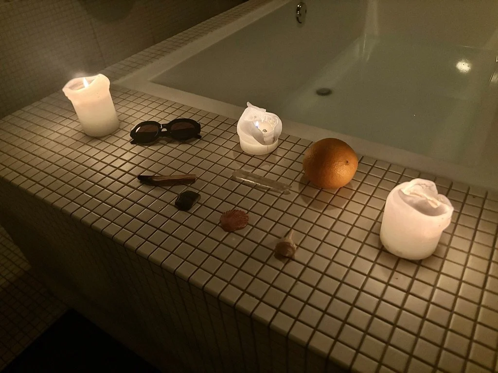 The large tub, square in the middle of the room, began filling with water. I placed the trinkets I had brought, fragments of seashells from the places I want to hold onto, a long crystal quartz from my mother, a stick of palo santo from the Ojai motel I love, candles, an orange, along the tiled edge like an altar. I added a few drops of vetiver and orange blossom essential oil to the tub.
